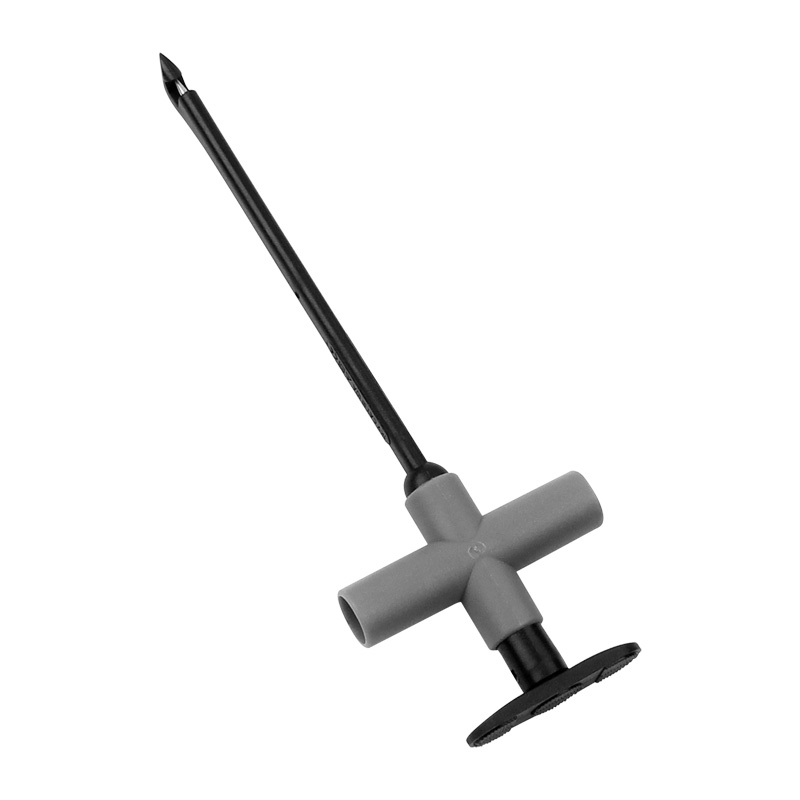 在某些情況下無法無法找到被測點而必須破開電線外皮對信號測試時,可以方便地使用這個工具,ETA3410全絕緣快速穿孔測試夾可穿透1.5至4毫米絕緣電線,獨特的V型線槽設計,確保測針的位置保持在電纜中間,尾部4mm插座可與萬用表或示波器的測試引線一起使用,簡單,安全,高效。使用方法就將4mm測試線纜插入穿刺測針的末端,測試電纜放入V型線槽中,松開按鈕,測試工具內的一個非常精細的探頭可以刺穿電纜護套和內導體直接接觸,從而在電纜內部進行信號快速無損檢測,測試后,松開按鈕,拆下電線,電纜護套留下針孔很容易密封,優質絕緣層可實現絕緣自愈。