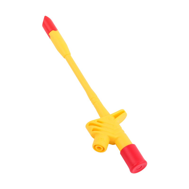 在某些情況下無法找到被測點而必須破開電線外皮對信號測試時,可以方便地使用這個工具,ETA3406全絕緣快速穿孔測試夾可穿透0.25至1.5mm2絕緣電線( ? 3.5mm ),獨特的V型線槽設計,確保測針的位置保持在電纜中間,尾部4mm插座可與萬用表或示波器的測試引線一起使用,簡單,安全,高效。使用方法就將4mm測試線纜插入穿刺測針的末端,測試電纜放入V型線槽中,松開按鈕,測試工具內的一個非常精細的探頭可以刺穿電纜護套和內導體直接接觸,從而在電纜內部進行信號快速無損檢測,測試后,松開按鈕,拆下電線,電纜護套留下針孔可實現絕緣自愈。