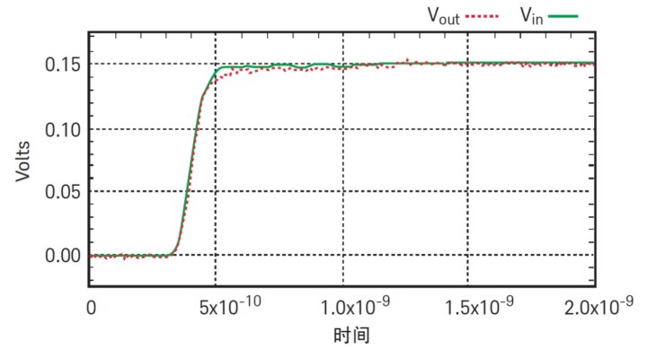 圖 5 顯示了對于輸入約 100 ps 上升時間的階躍信號,差分探頭所測得的時域響應。圖 6 顯示了對于輸入約 100 ps 上升時間的階躍信號,單端探頭所測得的時域響應。在這兩個圖中,紅色軌跡是探頭的輸出,綠色軌跡是探頭的輸入。應注意這不是探頭的階躍響應,而只是測量它們能在多大程度上跟蹤 100 ps 的階躍信號。為測量階躍響應,輸入必須是非常完美的、有極快上升時間的階躍信號,此時差分探頭能顯示出比單端探頭更快的上升時間。這兩種探頭都能很好地跟蹤 100 ps 的階躍信號。