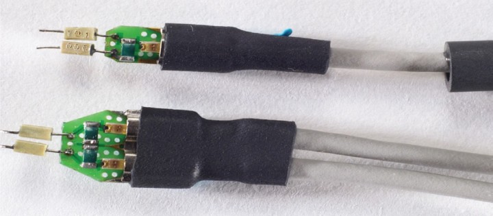 我們用簡化模型 ( 圖 1) 幫助比較,并用探頭放大器配合焊入式差分探頭前端和焊入式單端探頭前端測量數據。這兩種探頭前端的物理連接尺寸非常接近,因此它們的性能差別主要是因為差分和單端電路元件的布局造成的。圖 2 和圖 3 是這些探頭的照片。