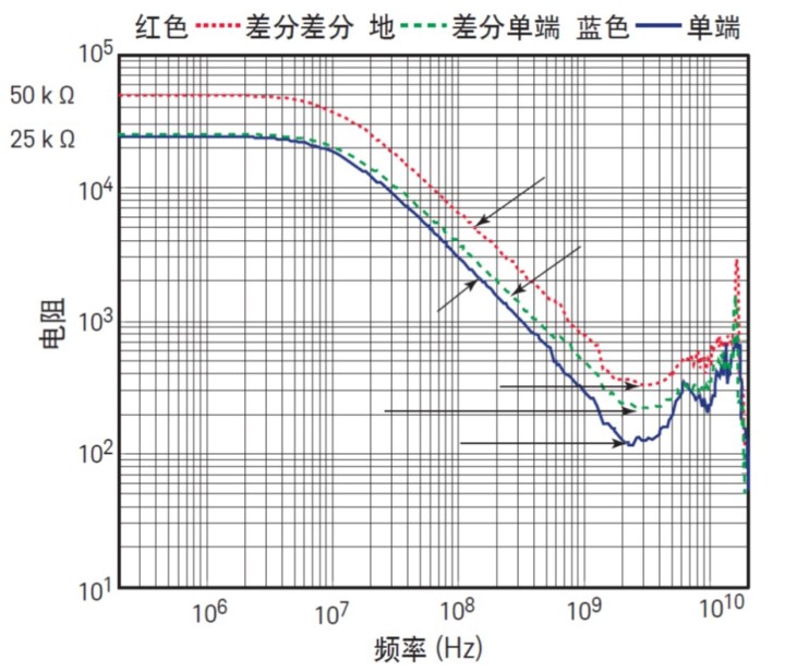 圖 8 是差分探頭和單端探頭的輸入阻抗 ( 幅值 ) 圖。紅色軌跡是施加差分源時所看到的差分探頭阻抗。綠色軌跡是施加單端源時看到的差分探頭阻抗,藍色軌跡是施加單端源時看到的單端探頭阻抗。圖 8 中標注了這三種情況的直流電阻、電容和最小電感值。應注意差分探頭和單端探頭對單端信號的輸入阻抗很類似。