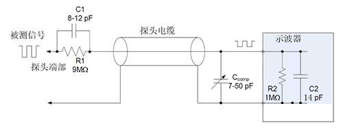 無源探頭的衰減功能是通過內(nèi)部電阻器來實現(xiàn)的,這一設計擴大了示波器的電壓測量范圍。當內(nèi)部電阻器與示波器的輸入電阻配合使用時,會形成一個分壓器。以典型的10x探頭為例,其內(nèi)部裝有一個9MΩ的電阻器。當這個探頭與具有1MΩ輸入阻抗的示波器連接時,會在示波器的輸入通道上產(chǎn)生10:1的衰減比。這意味著示波器上顯示的信號幅度將是實際測量信號幅度的十分之一。因此,在使用這類探頭時,我們還需要在示波器的通道設置中調(diào)整衰減比至相應的值(如10X),以確保測量結果的準確性
