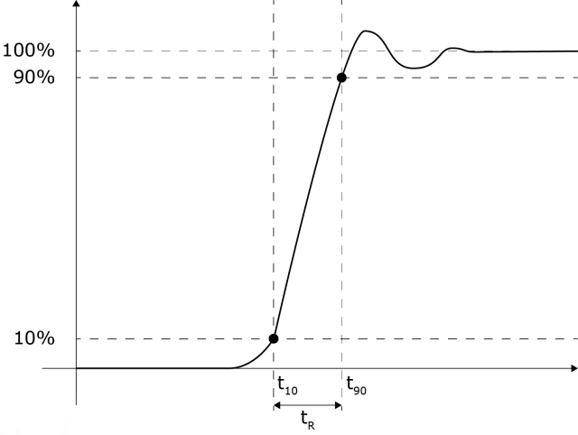 如果示波器的輸入放大器具有類似于單極點 RC 濾波器的簡單頻率響應,則此公式中的分子 0.35 是準確的。實際上,許多示波器具有更快的滾降速度,以便在通帶中提供更平坦的頻率響應,這可以將分子增加到 0.45 甚至更高。該公式還假設上升時間是在信號的 10% 和 90% 電壓電平之間測量的。